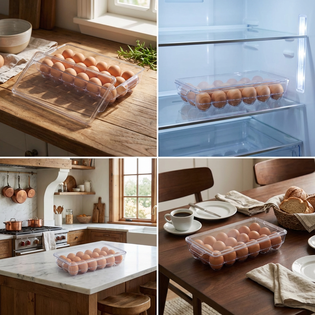 Fabricado en plástico de alta calidad, este contenedor ahorra espacio al apilarse, ofreciendo una solución práctica y eficiente para organizar tus huevos.