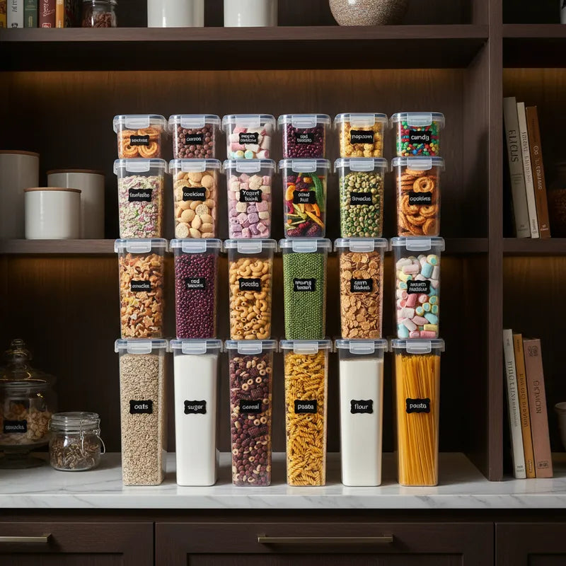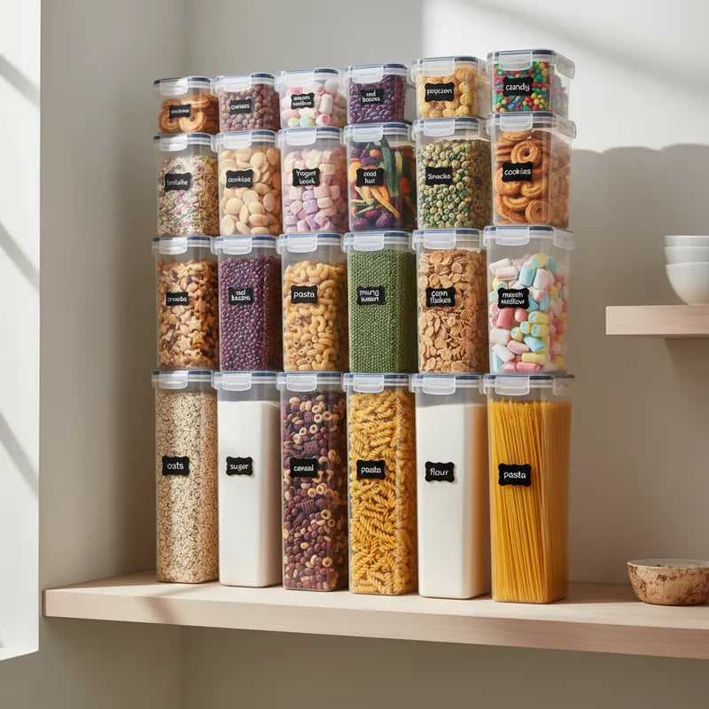 Organizá tu cocina de forma práctica y moderna con este set de 24 contenedores apilables de Homilu. Fabricados en plástico transparente libre de BPA, con cierre hermético de silicona negra, son ideales para mantener alimentos secos frescos y organizados.