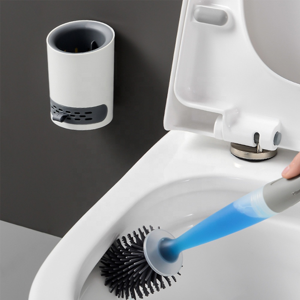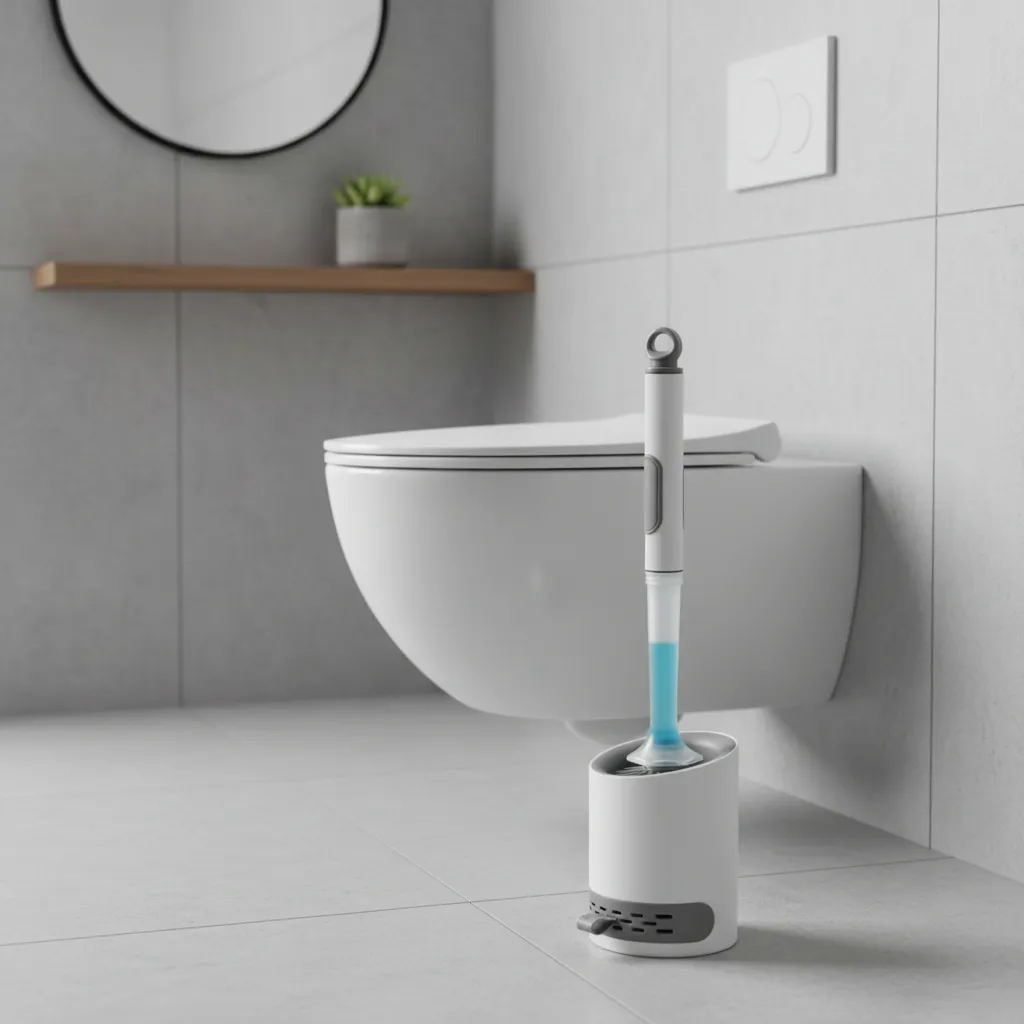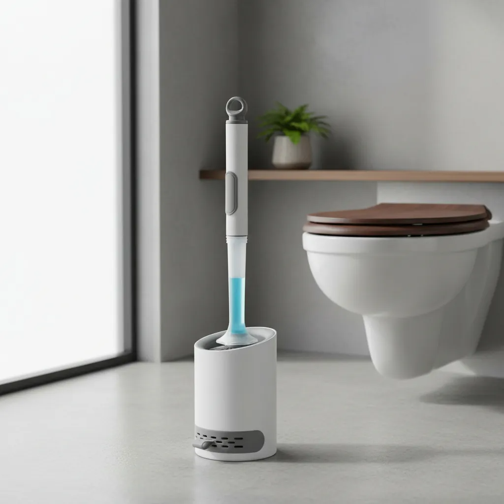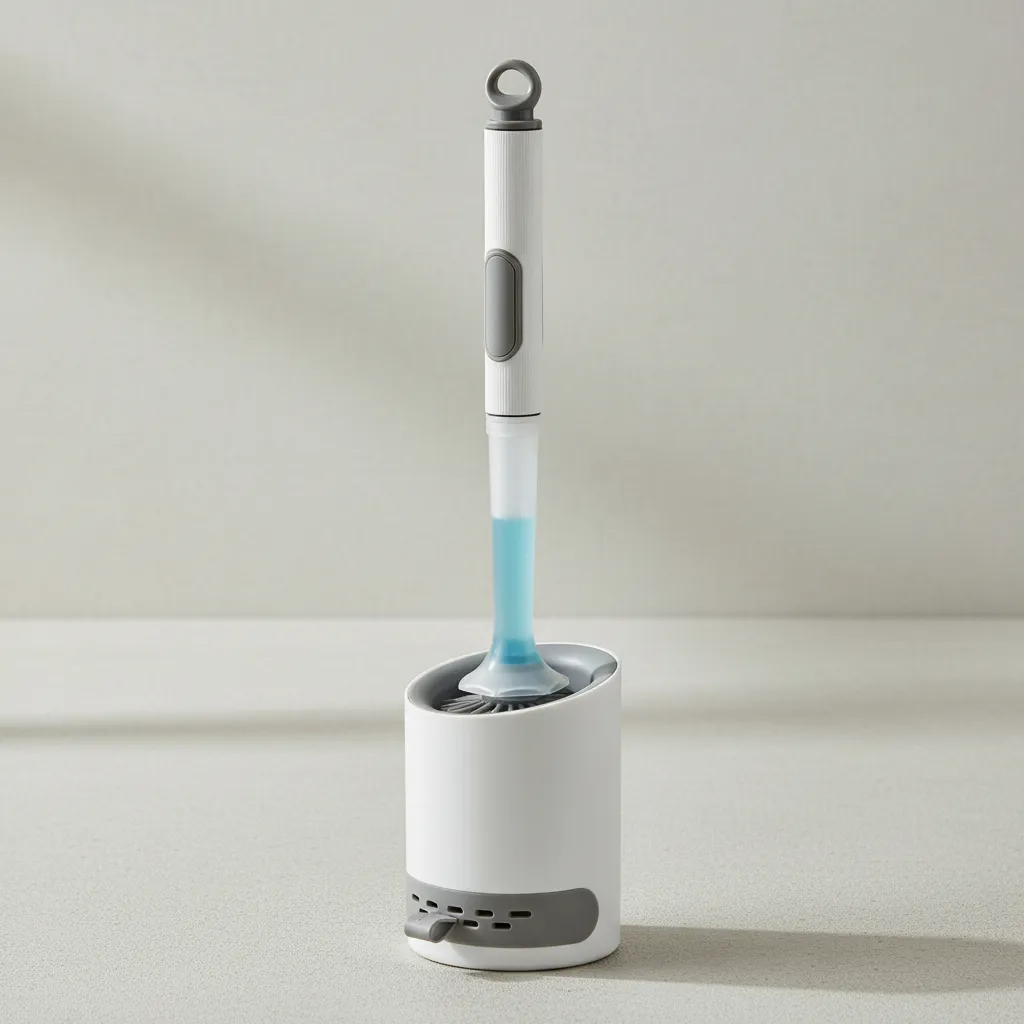 Cepillo práctico para la limpieza del baño, con dispensador de jabón integrado que permite aplicar el producto directamente durante el uso, facilitando la limpieza de distintas superficies.