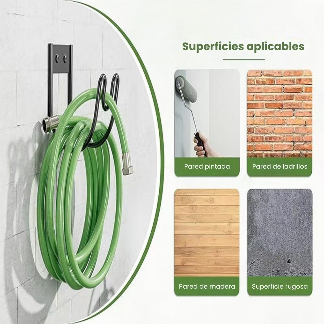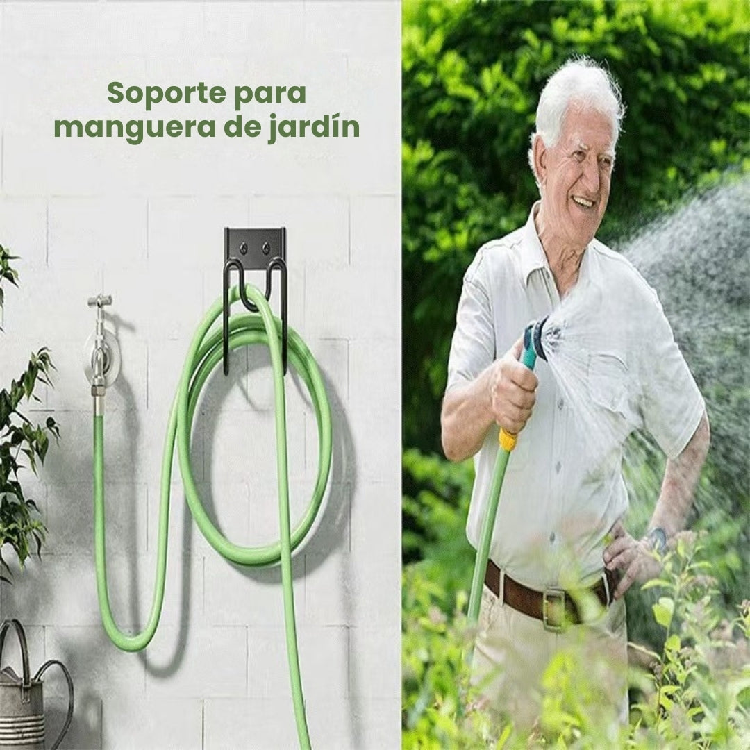 Soporte resistente y funcional para organizar y colgar mangueras de riego en la pared.
