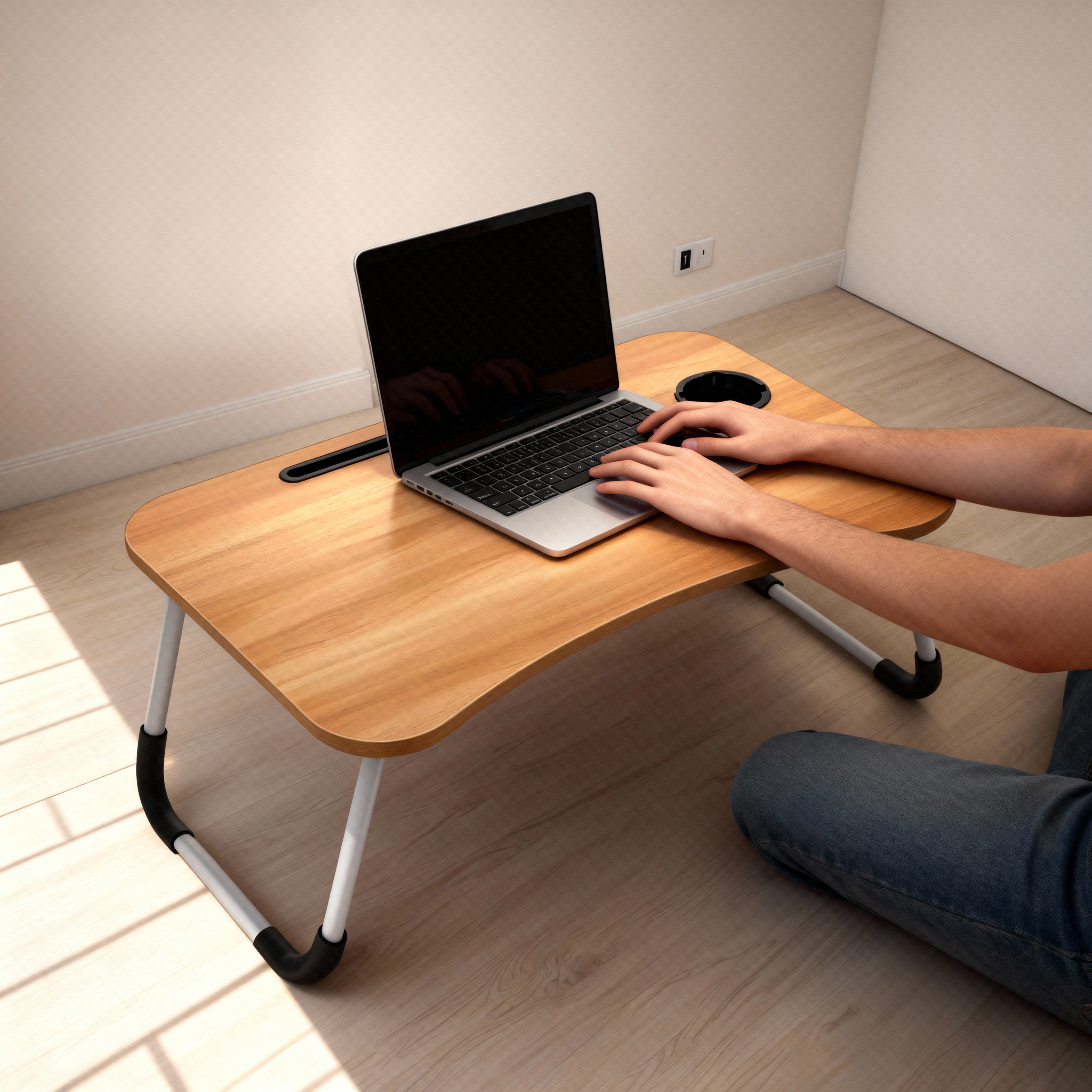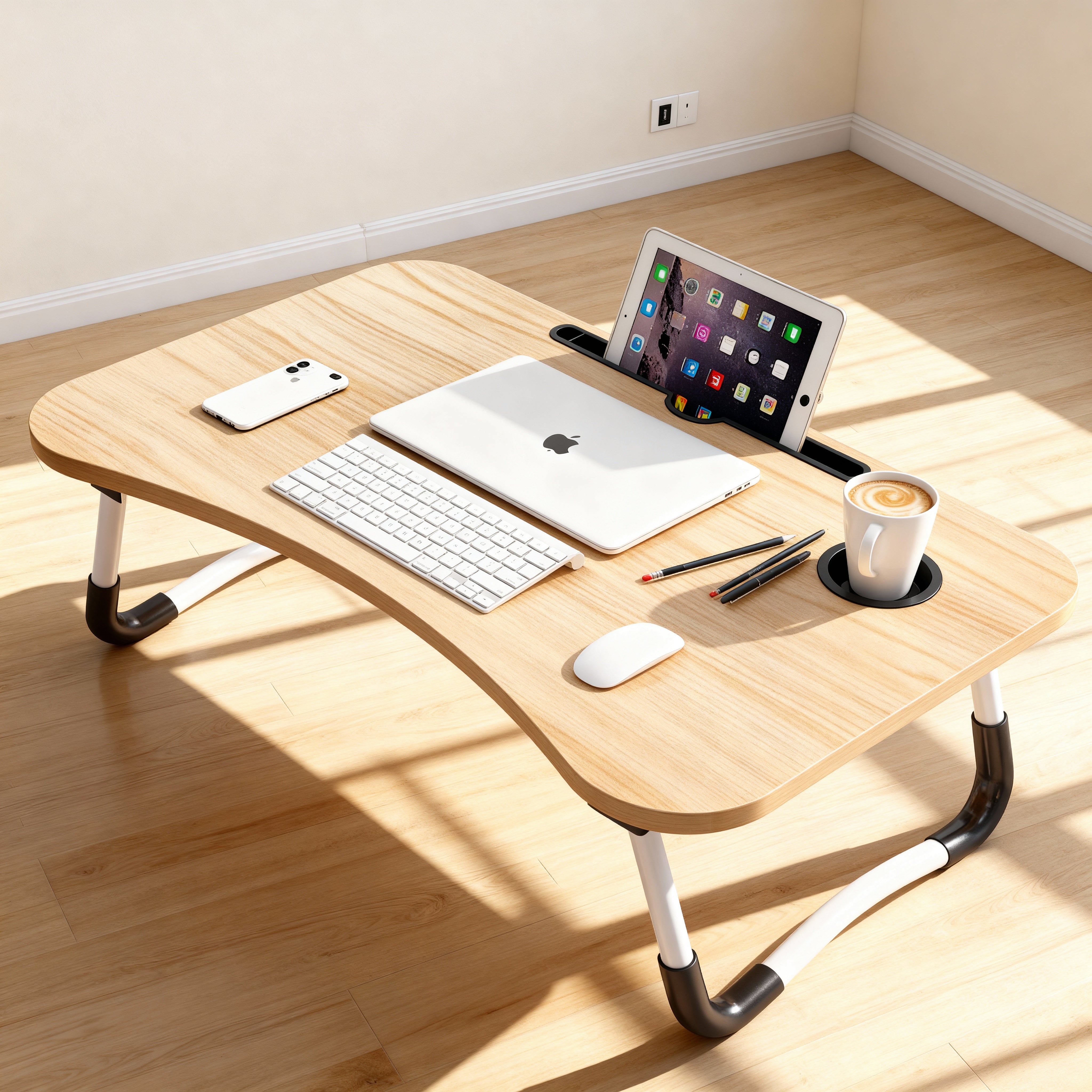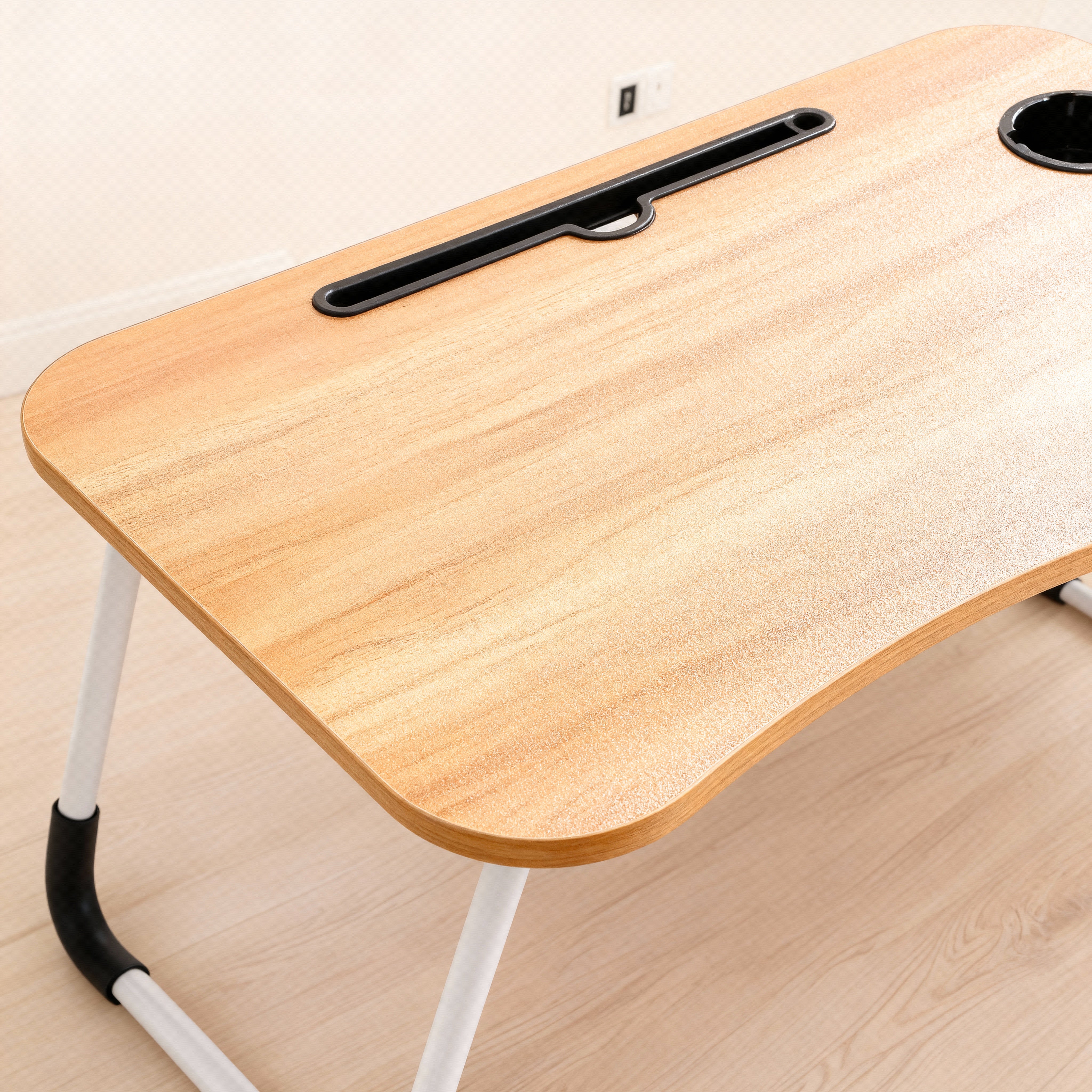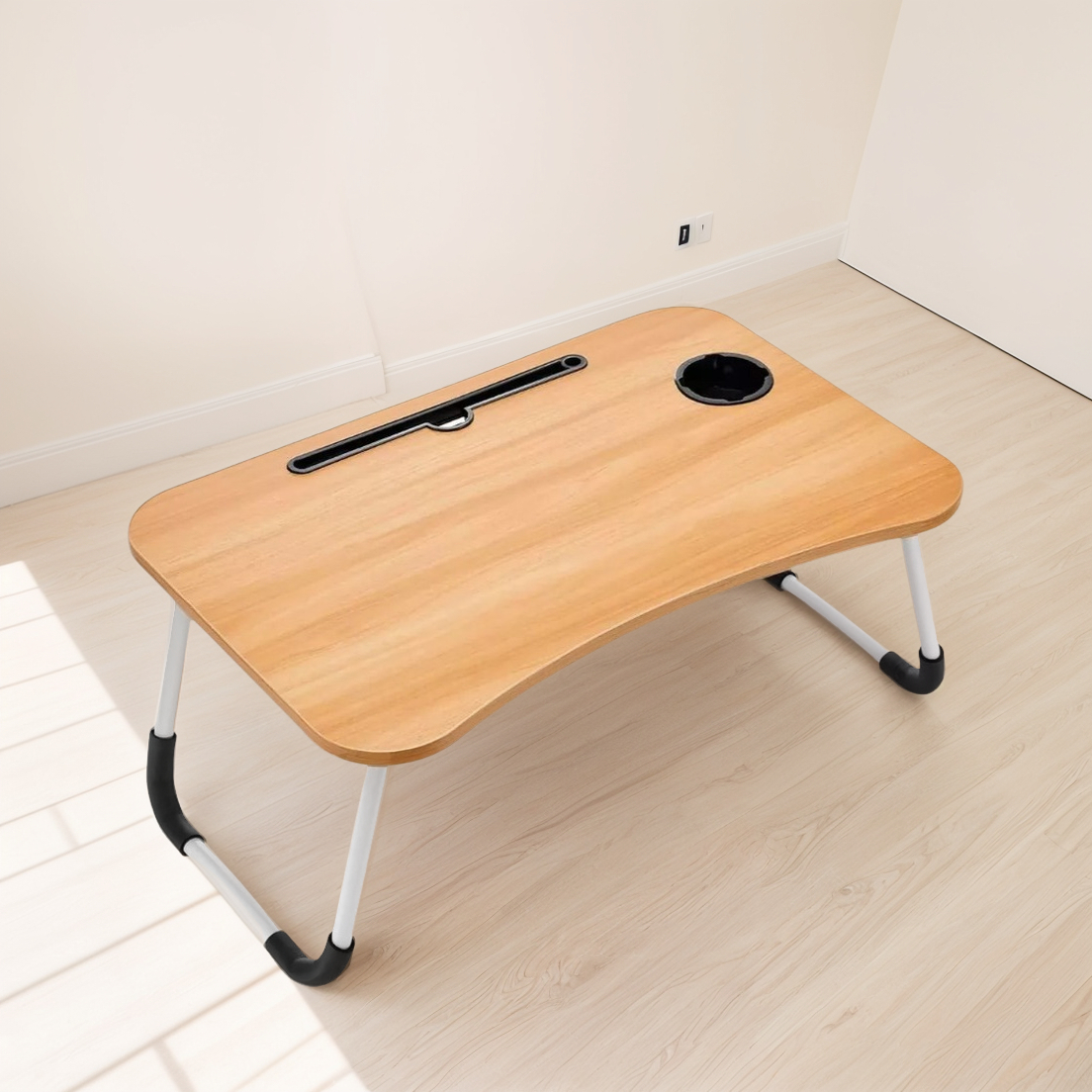 Mesa plegable y portátil, ideal para usar la computadora, estudiar, trabajar o desayunar cómodamente desde la cama o el sofá.