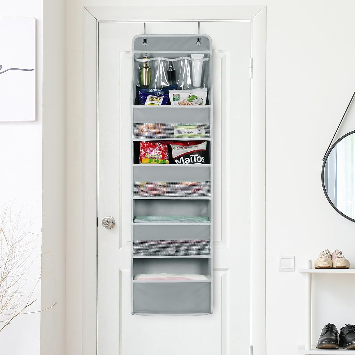 Ventana de visualización de PVC: el bolsillo visible en la parte delantera de este almacenamiento sobre la puerta te permite ver el contenido de cada bolsillo, conocer claramente los artículos colocados en cada capa y obtener una visión más clara al sacar los artículos. ¡Gestiona mejor tus pertenencias!