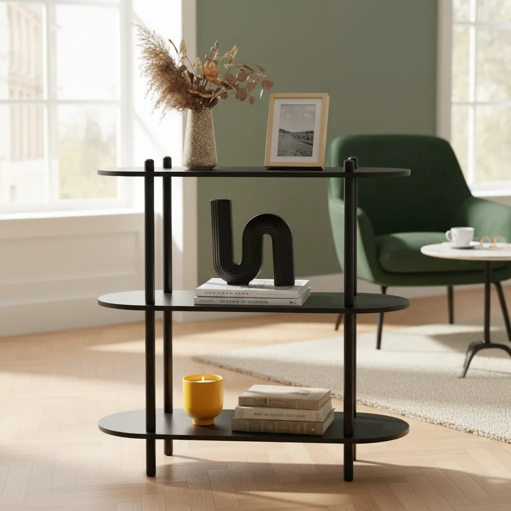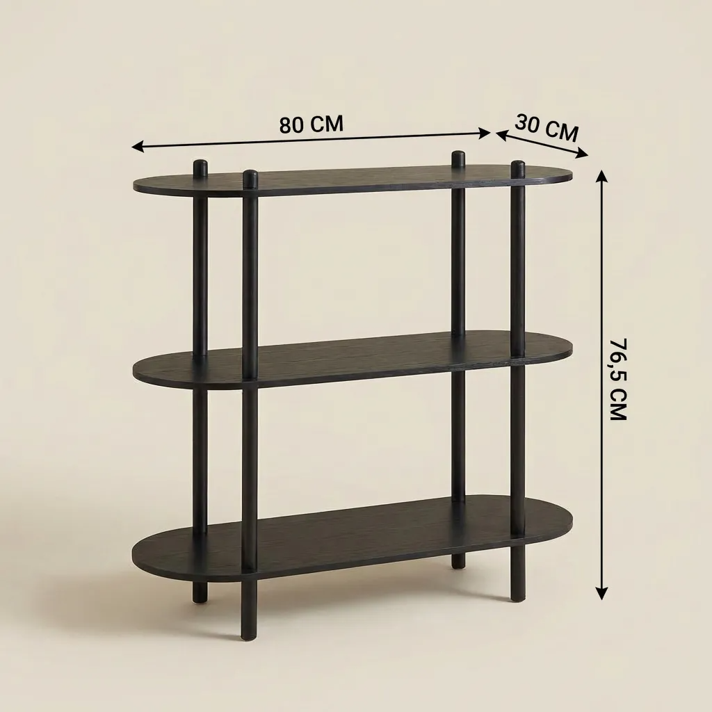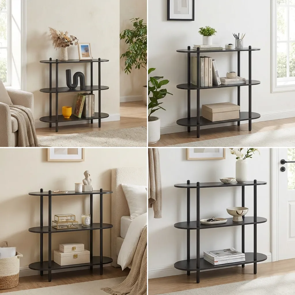Consola de 3 niveles Luciana, ideal para usar como mueble recibidor o mesa de apoyo en hall de entrada, living u otros ambientes del hogar. Su diseño en color negro permite organizar y exhibir objetos decorativos de forma práctica y ordenada.