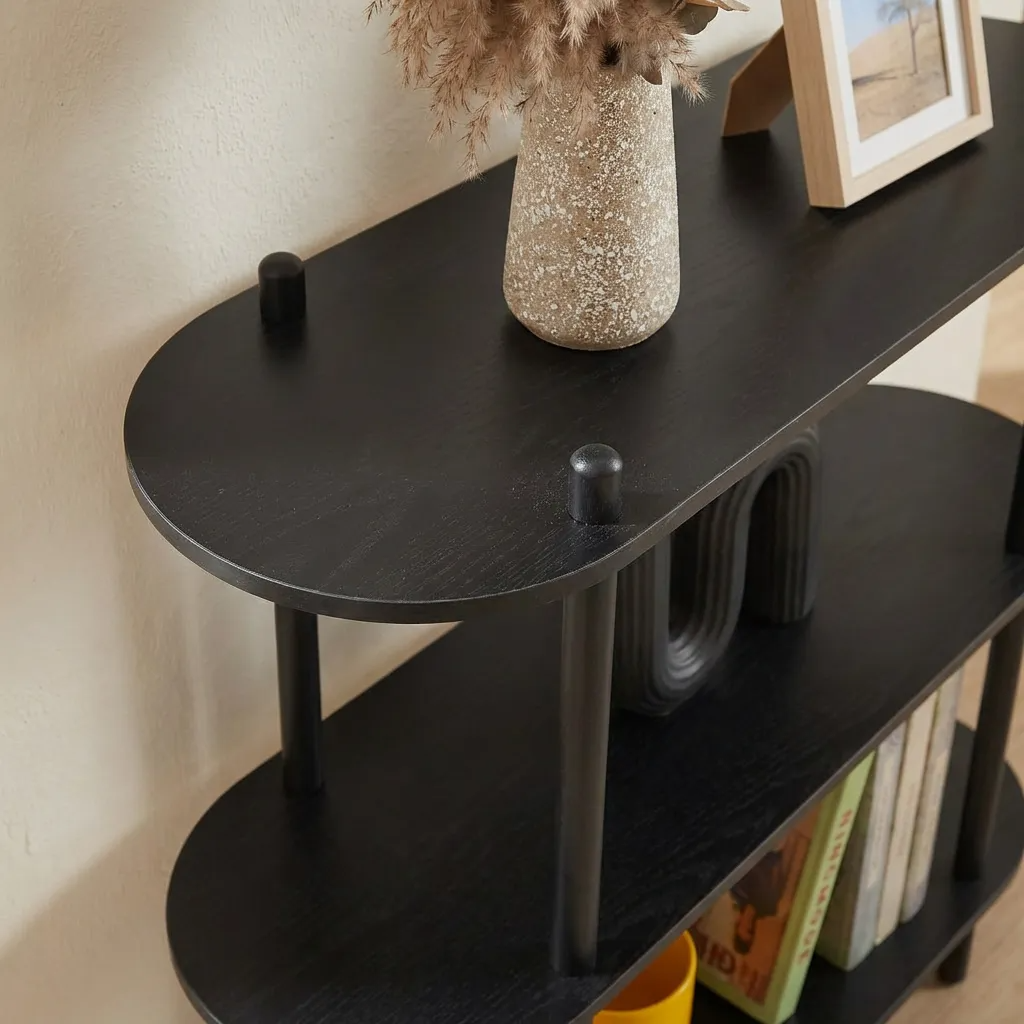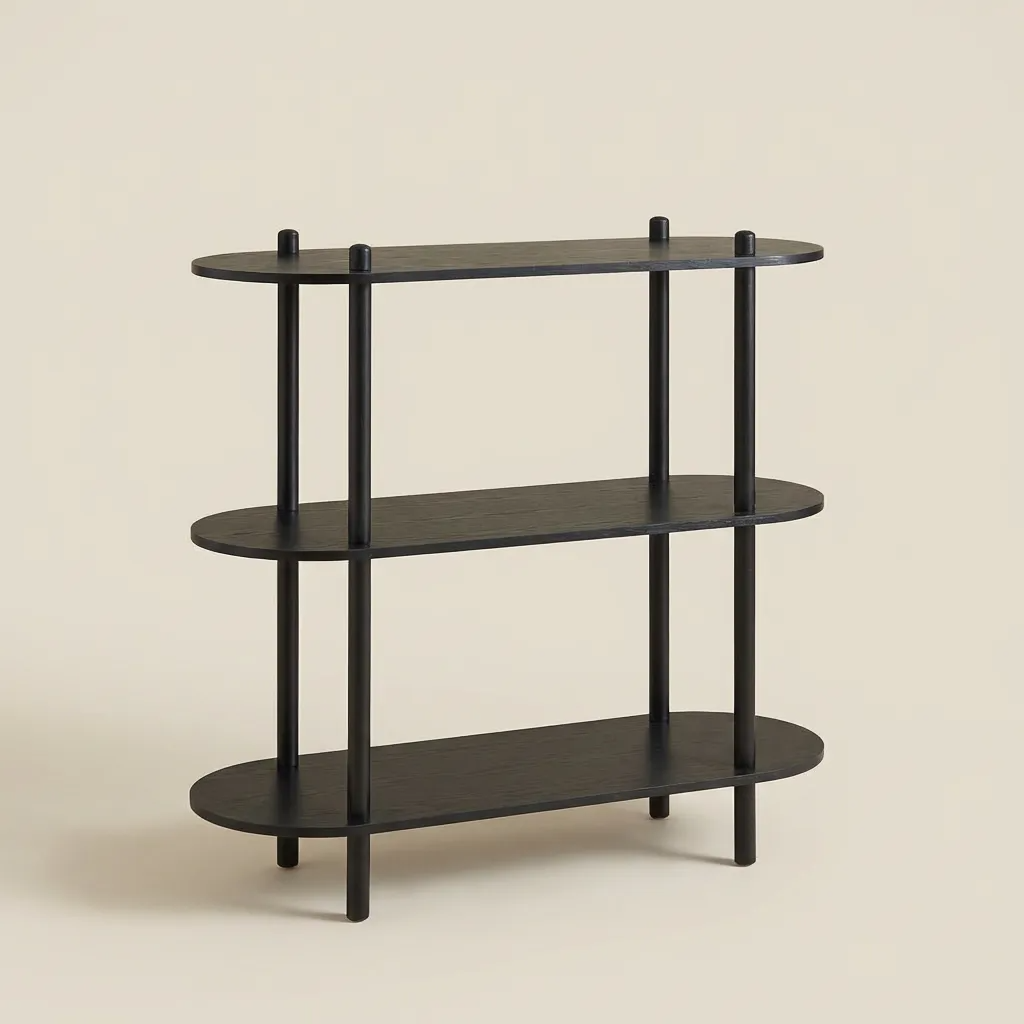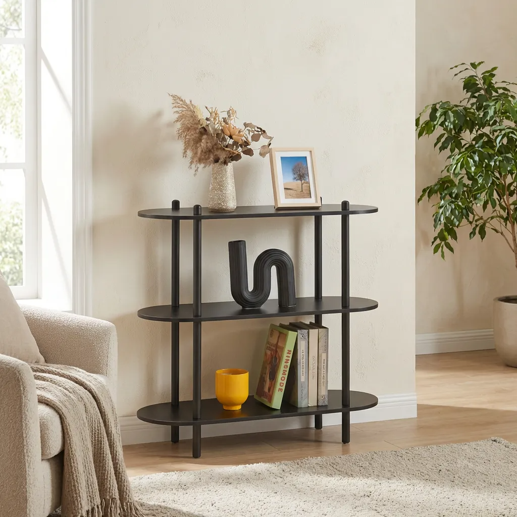 Consola de 3 niveles Luciana, ideal para usar como mueble recibidor o mesa de apoyo en hall de entrada, living u otros ambientes del hogar. Su diseño en color negro permite organizar y exhibir objetos decorativos de forma práctica y ordenada.