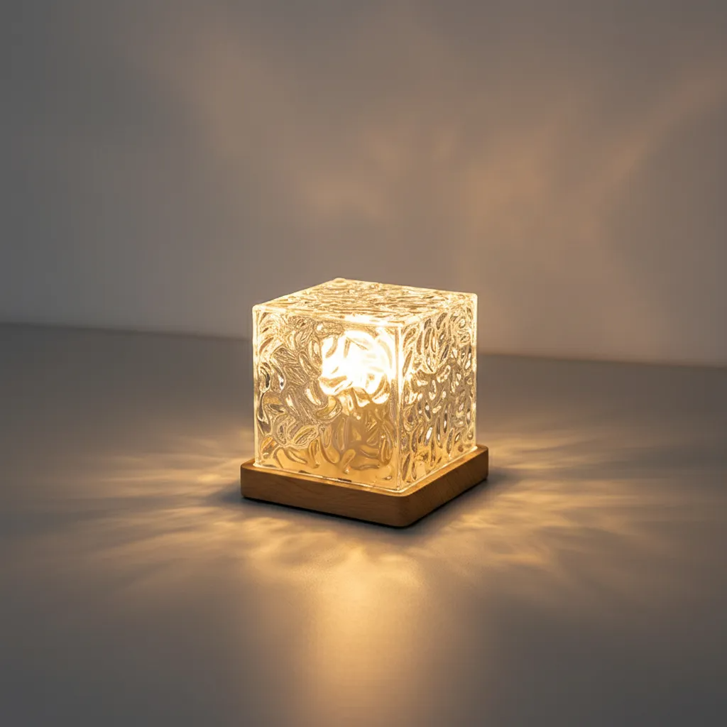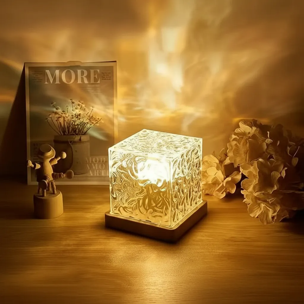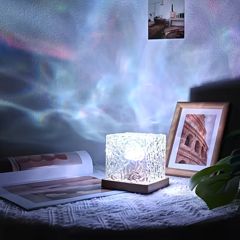 Lámpara decorativa compacta que proyecta un efecto visual de reflejos de agua, ideal para crear ambientes cálidos y relajantes en distintos espacios del hogar.