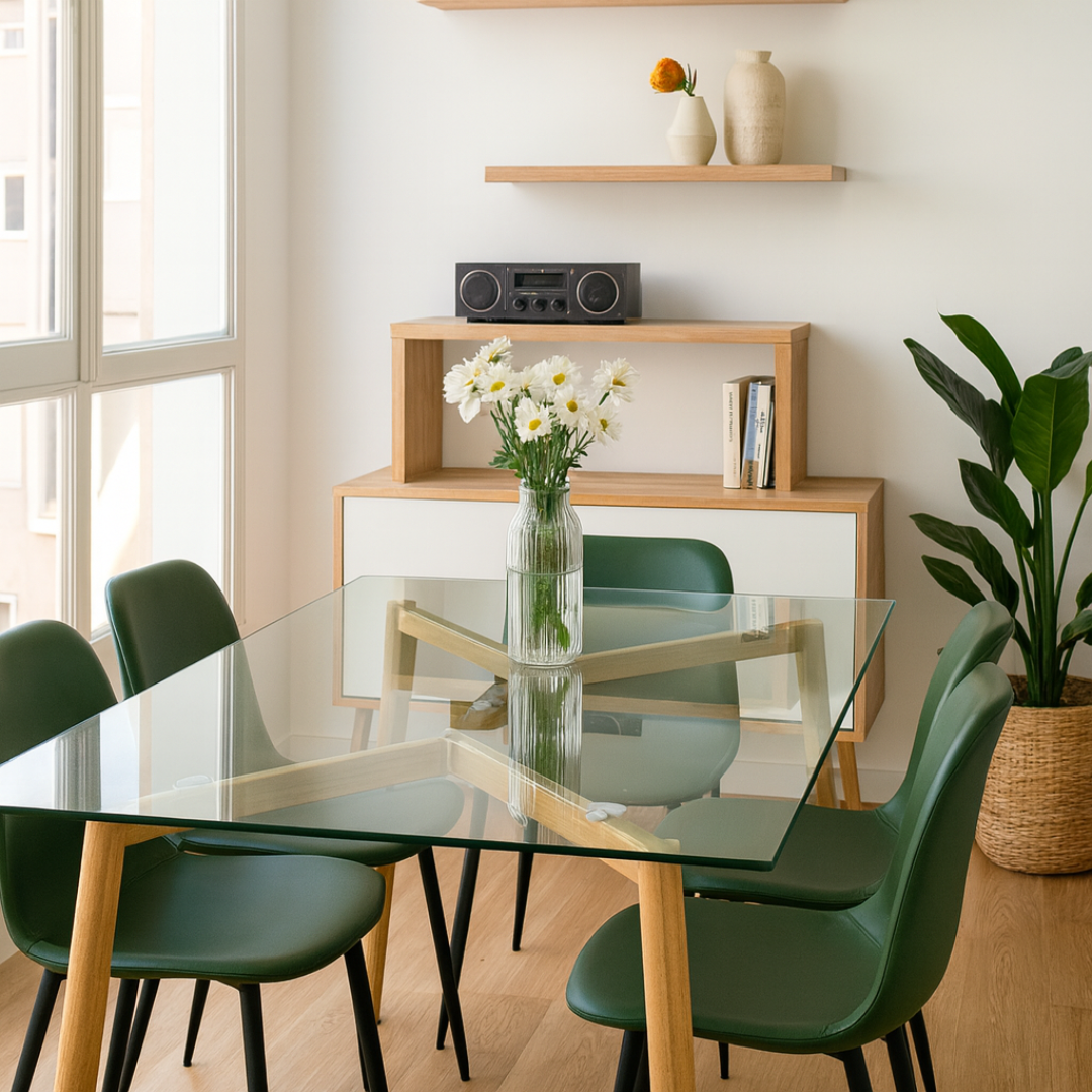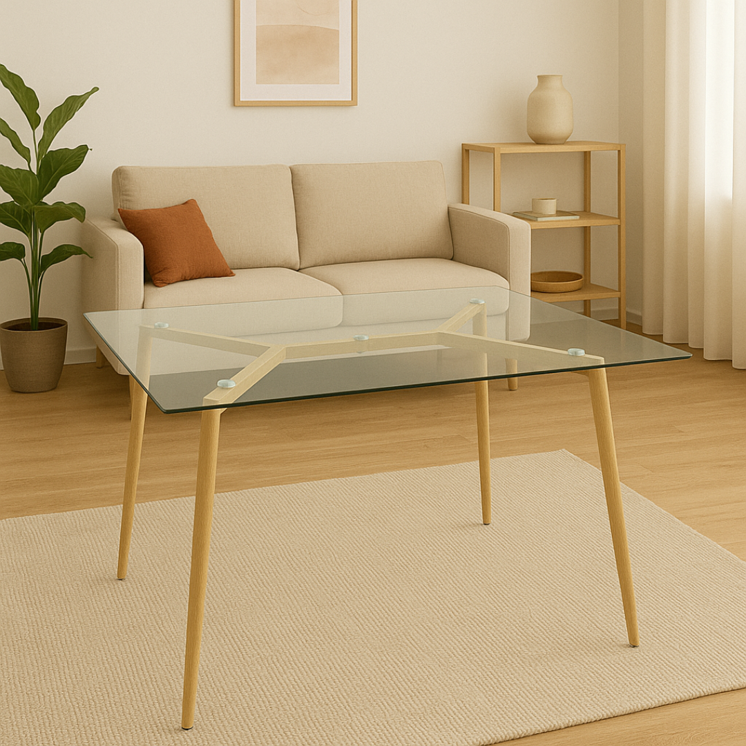 Dale un toque de elegancia y amplitud a tu comedor con esta mesa de vidrio templado. Su estructura firme y su estilo minimalista la hacen ideal para cualquier ambiente moderno o contemporáneo.