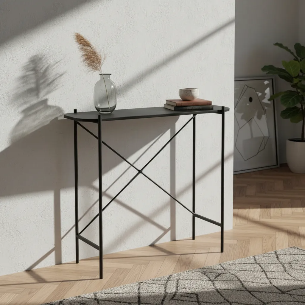 Mesa recibidora, ideal para ubicar en la entrada del hogar, hall o living. Su diseño combina un estilo moderno e industrial, funcional para organizar y decorar espacios.