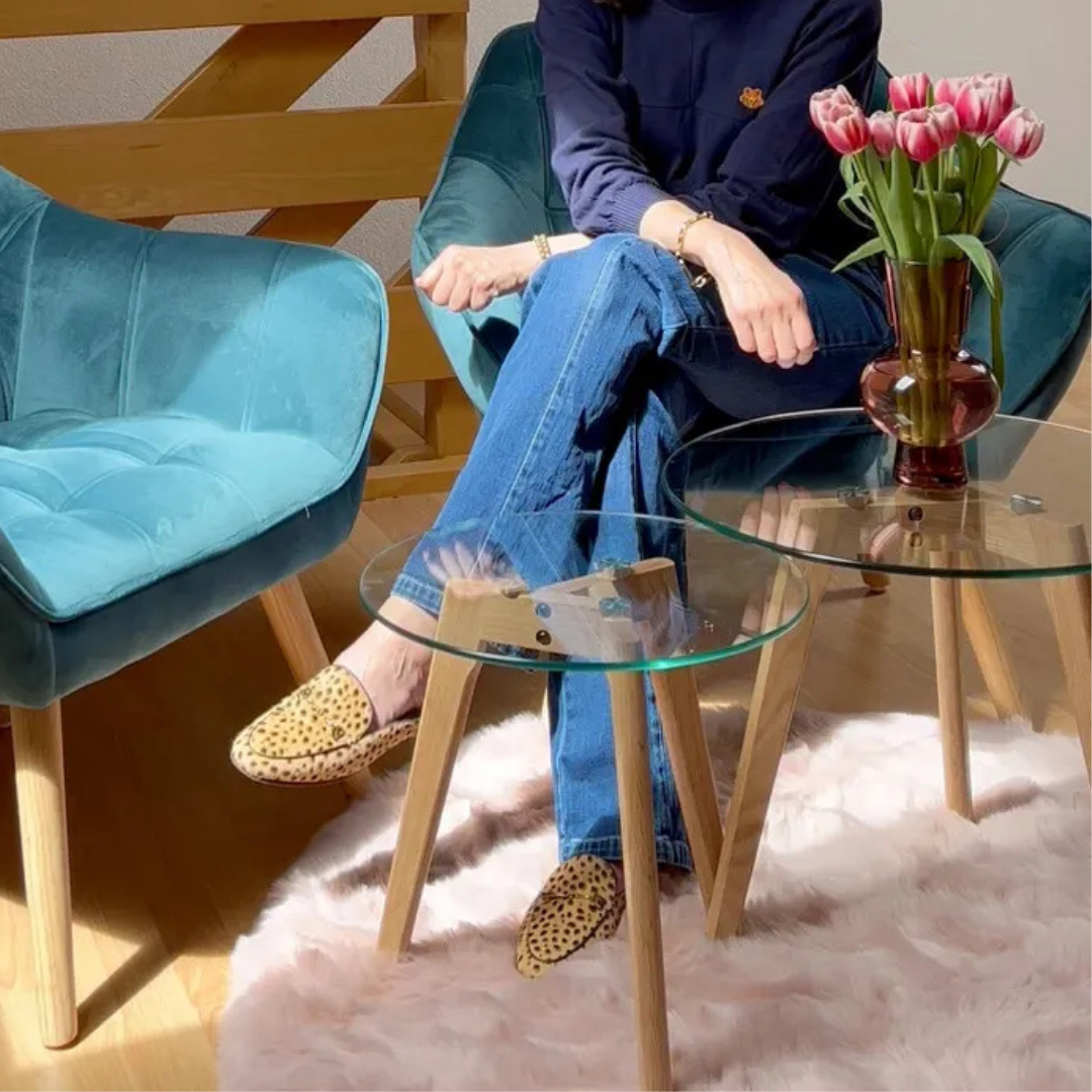 El set de mesas auxiliares Homilu combina elegancia escandinava y funcionalidad moderna. Con su diseño minimalista, patas de madera natural y tapa de vidrio templado transparente, estas mesas aportan ligereza visual y un toque sofisticado a cualquier ambiente.