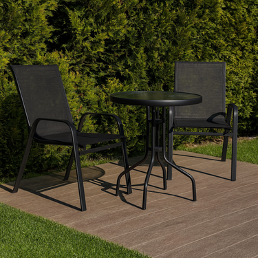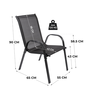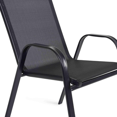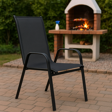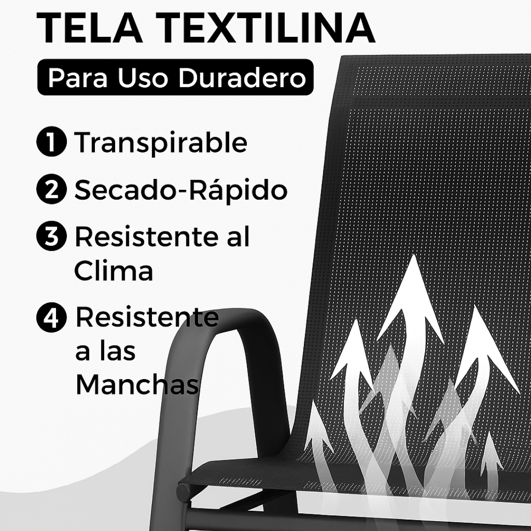 Fabricada con una estructura de hierro de alta calidad resistente al óxido, esta silla está diseñada para soportar el sol, la lluvia y las condiciones del exterior durante todo el año. Su tejido de textilina transpirable y de rápido secado garantiza comodidad incluso en los días más calurosos.