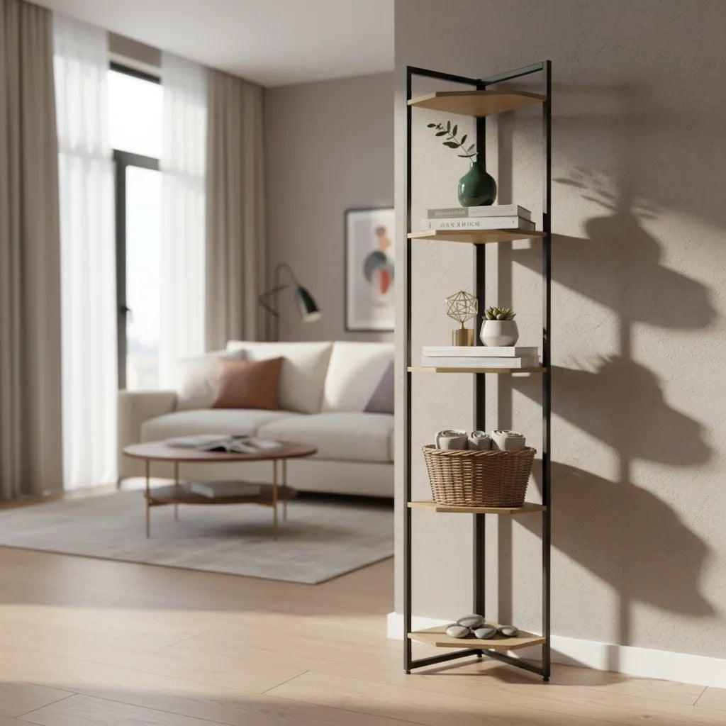 Aprovechá al máximo cada rincón de tu hogar con esta estantería esquinera de diseño moderno e industrial. Fabricada con estructura metálica resistente y repisas de madera MDF, ofrece una combinación perfecta entre estilo, practicidad y durabilidad.