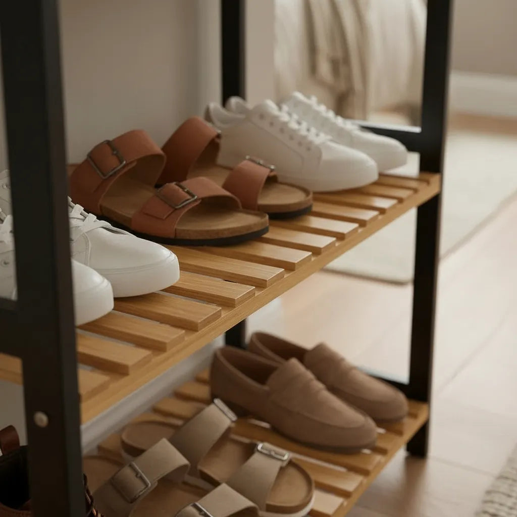 - Estantes de madera con diseño abierto que facilitan la ventilación y limpieza.