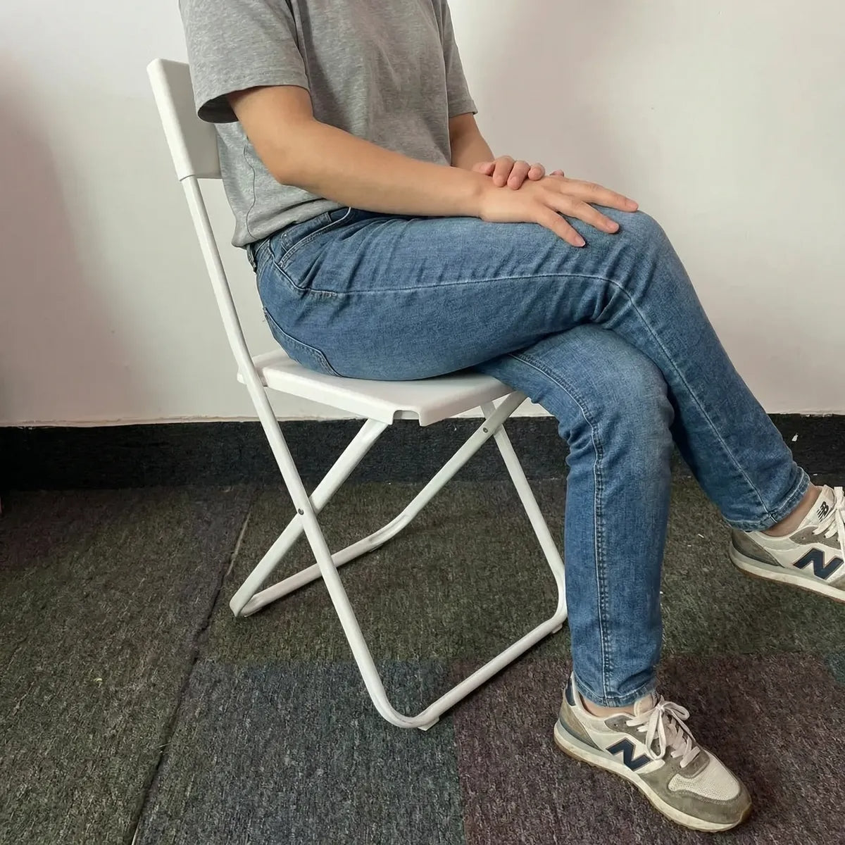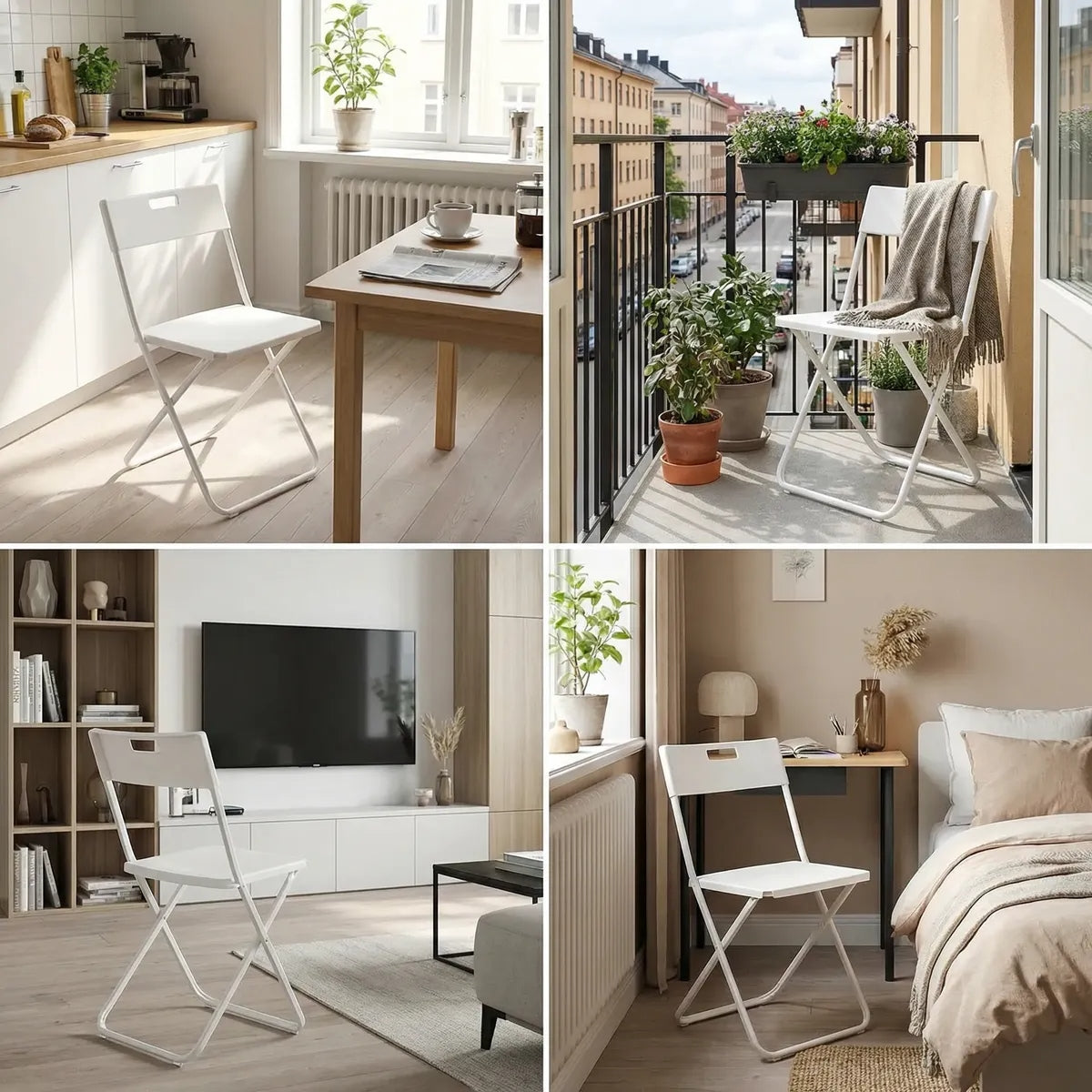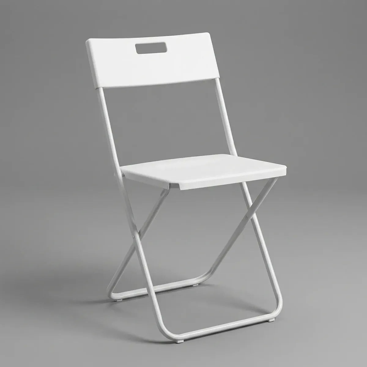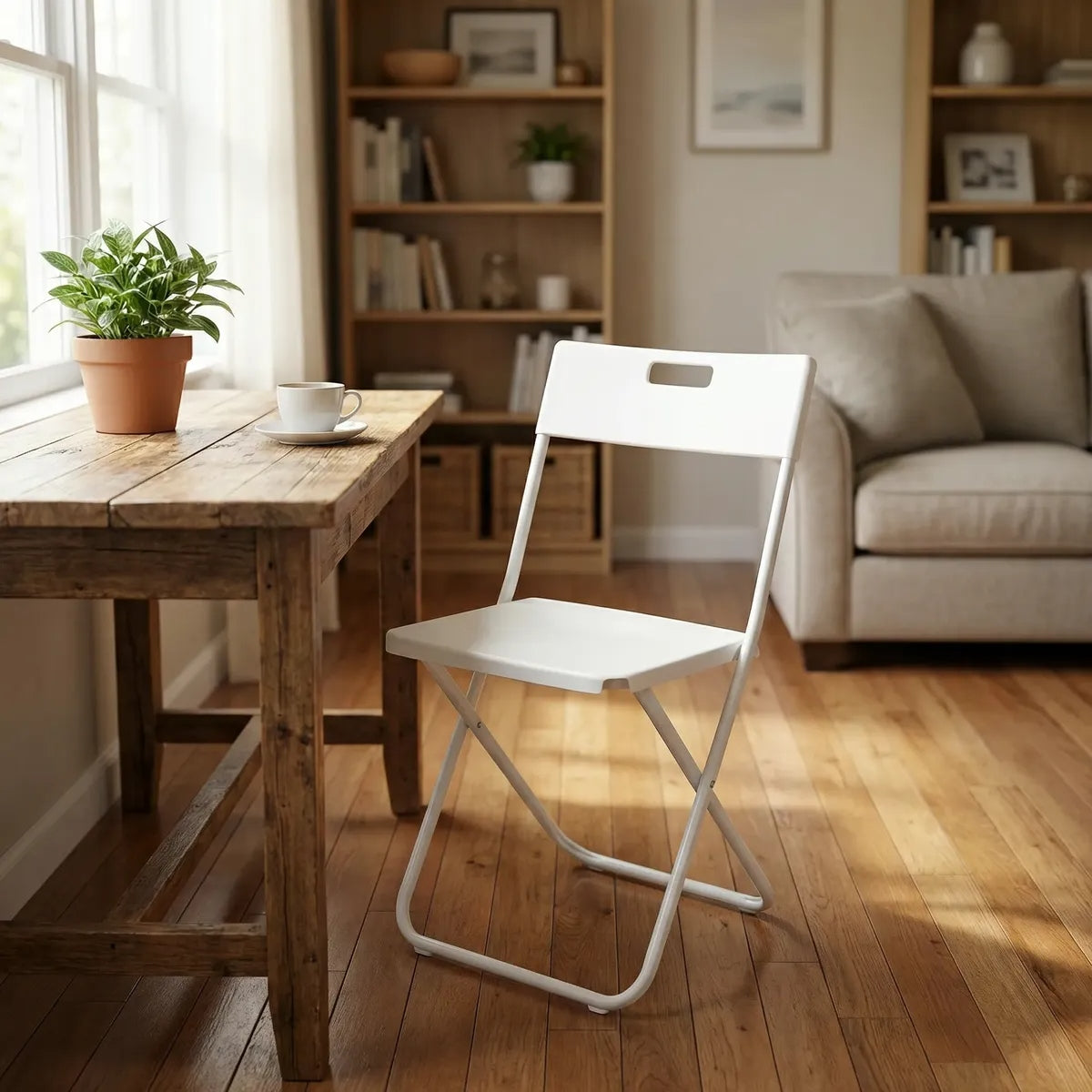Silla plegable de 42 x 39 x 78 cm en color blanco, fabricada en PP (polipropileno), resistente y liviana. Ideal para optimizar espacio y usar tanto en interiores como exteriores.