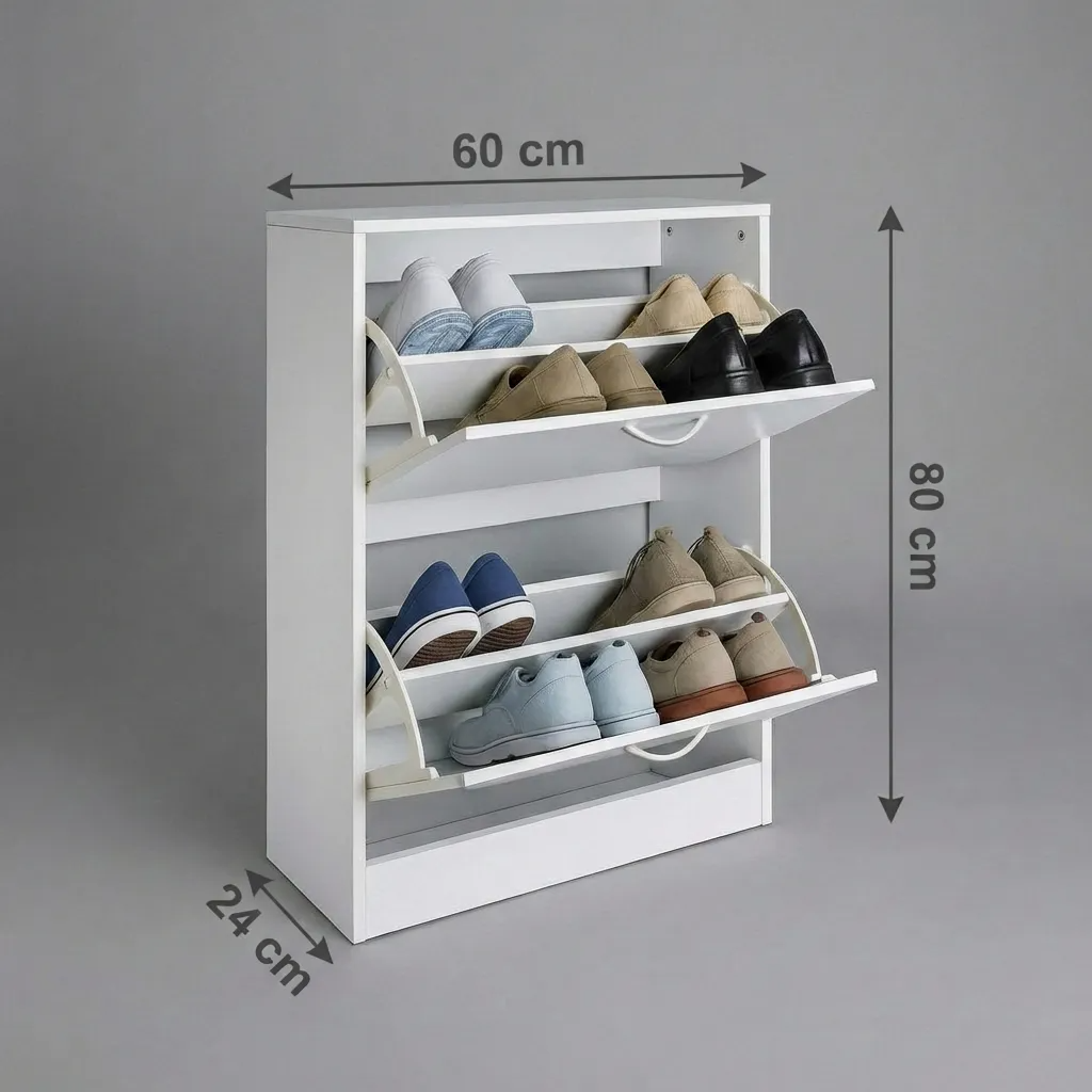 Zapatera Ona, ideal para organizar calzado en dormitorio, vestidor o entrada del hogar. Su diseño en color blanco es simple y funcional, permitiendo mantener el orden sin ocupar demasiado espacio.
